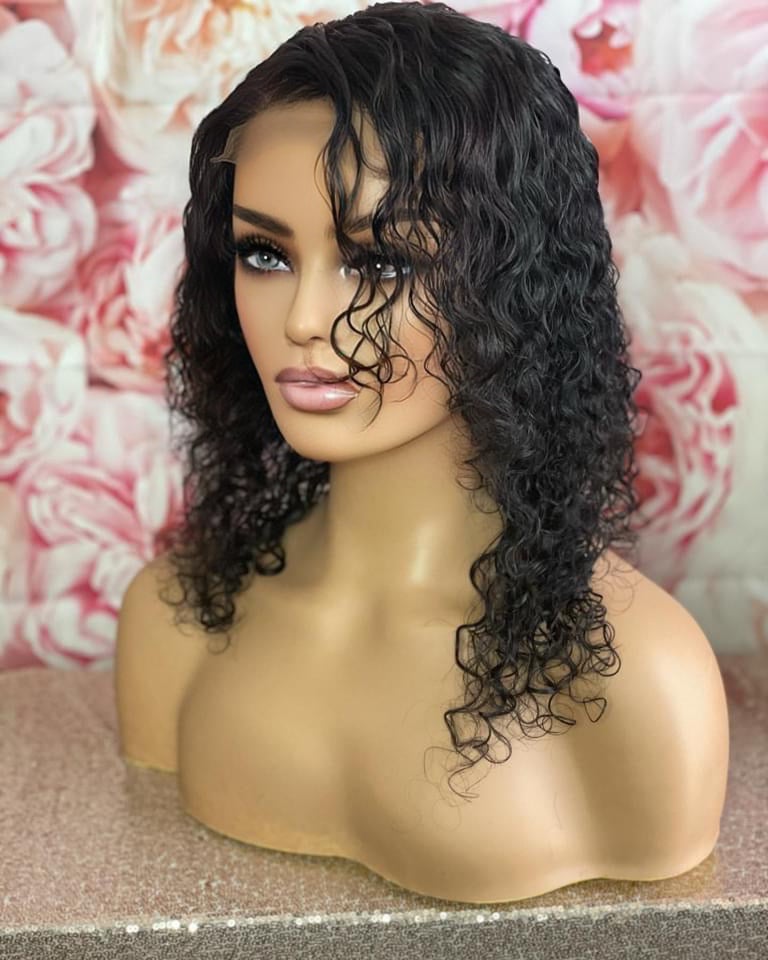 Glueless 4x4 Lace Closure Swiss Lace Bohemian Curl Texture Layered 14” Fits head size 23” Color Black Fully Customized with bleached knots and pre-plucked.